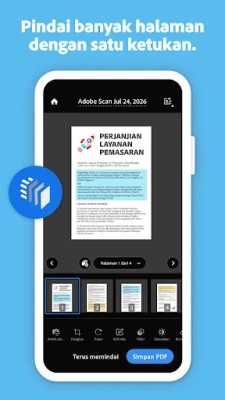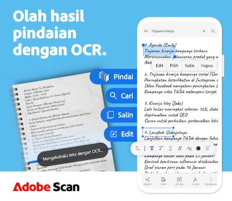 Adobe Scan: Scanner PDF, OCR mengubah perangkat seluler Anda menjadi pemindai dokumen dan PDF. Pindai dokumen kertas dengan hasil lurus, rapi, dan profesional. Ubah ke PDF, JPEG, serta konversi gambar ke teks dengan mudah. Kelola file digital Anda secara efisien.