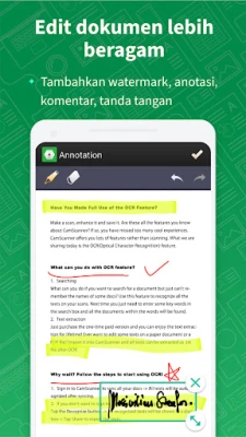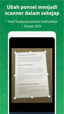 Kualitas hasil pemindaian adalah prioritas utama CamScanner. Dengan teknologi pemotongan cerdas dan fitur peningkat gambar otomatis, setiap dokumen Anda akan tampil jelas, tajam, dengan warna dan resolusi optimal layaknya dokumen asli. Lebih dari itu, fitur Pengenalan Karakter Optik (OCR) terdepan dari CamScanner memungkinkan Anda mengekstrak teks dari gambar atau PDF yang dipindai. Teks ini dapat dicari, diedit, atau dibagikan dengan mudah, membuka peluang baru untuk pengelolaan informasi. CamScanner juga mempermudah proses berbagi dokumen Anda dalam format PDF atau JPEG melalui berbagai platform media sosial, email, atau tautan unduhan.