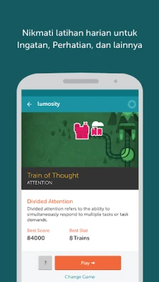 Lumosity menawarkan program latihan otak harian dengan 25+ permainan kecerdasan. Tantang ingatan, perhatian, dan keterampilan kognitif Anda. Permainan menyesuaikan untuk menjaga tantangan tetap relevan bagi pengguna di seluruh dunia.